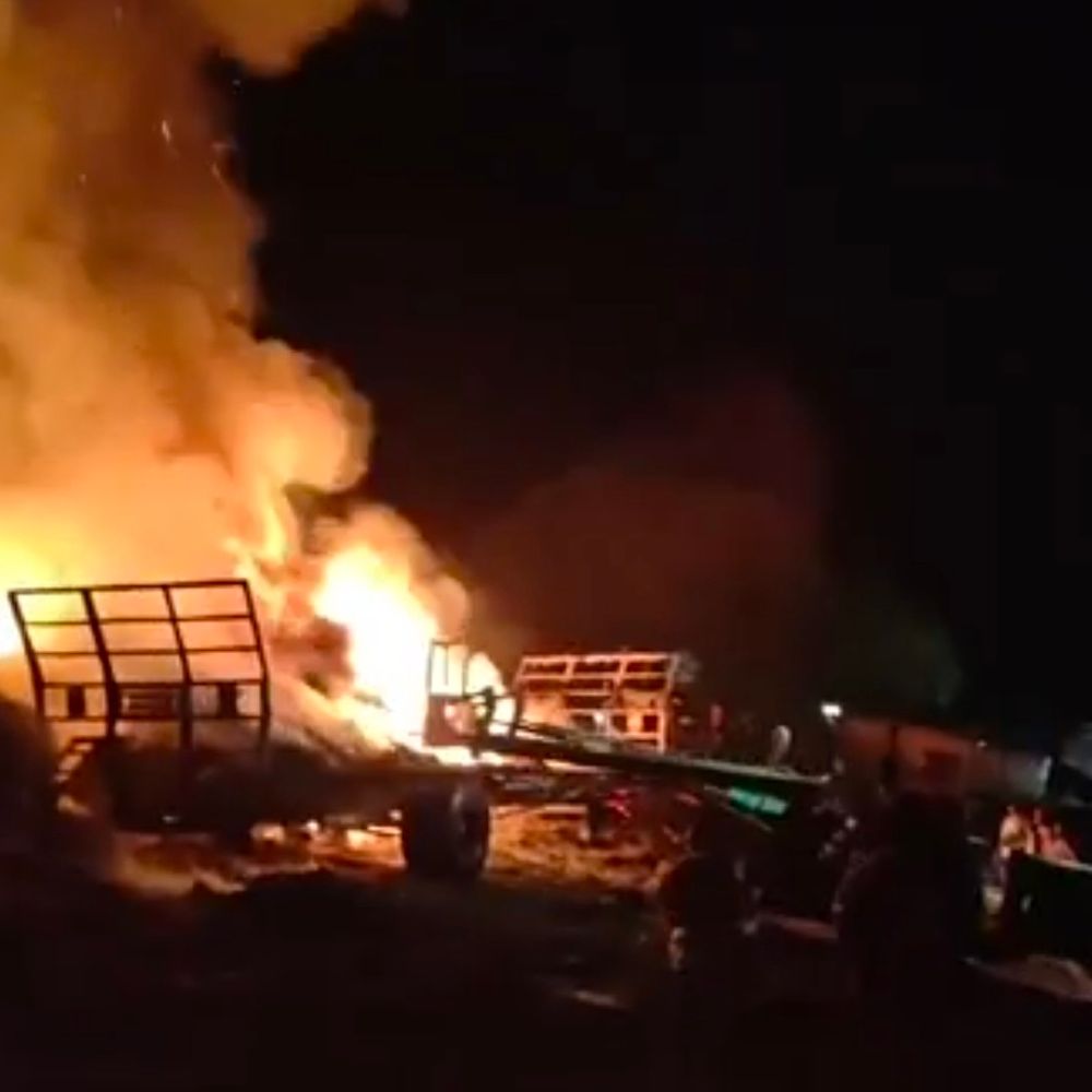 उकलाना में भूसे से भरी ट्राली में लगी आग:बिजली की तारों की चपेट में आई, चिंगारी से भड़की, फायर ब्रिगेड ने पाया काबू