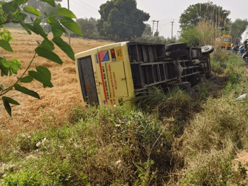 हांसी में बच्चों से भरी स्कूल बस पलटी:मुंढ़ाल जा रहे 38 स्टूडेंट्स सेफ; ट्रक के साइड दबाने से खेतों में उतरी, चीख पुकार मची
