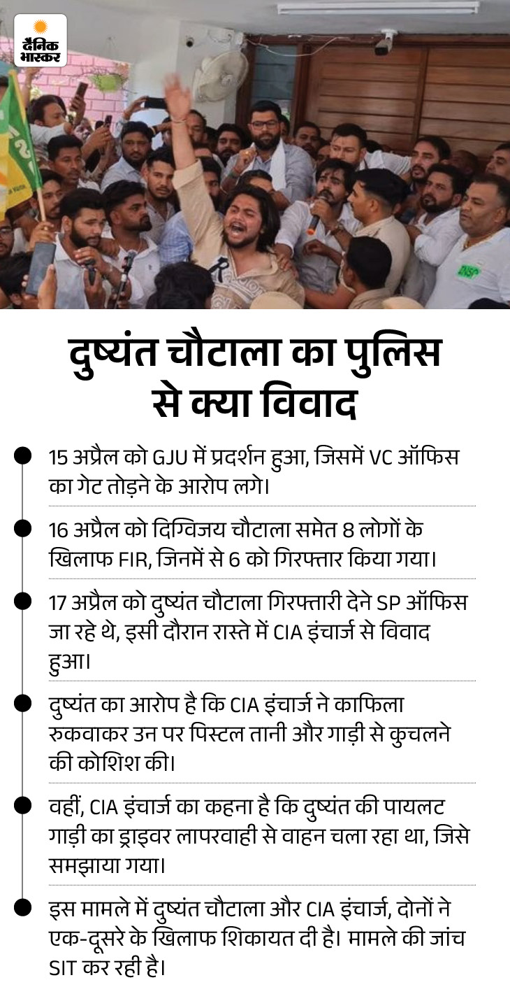 इन्हीं नेताओं की गिरफ्तारी के बाद 17 अप्रैल को पूर्व डिप्टी CM दुष्यंत चौटाला हिसार में गिरफ्तारी देने जा रहे थे। उन्होंने आरोप लगाया कि CIA इंचार्ज ने काफिला रोककर वैपन दिखाया और कुचलने की कोशिश की। दुष्यंत भी CIA इंचार्ज के खिलाफ शिकायत दे चुके हैं। वहीं CIA इंचार्ज ने भी दुष्यंत के खिलाफ शिकायत दी है।