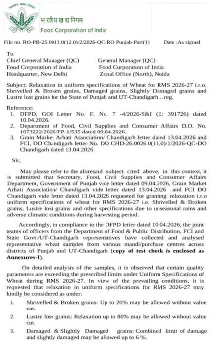 किसानों की मांगों को देखते हुए केंद्रीय मंत्री रवनीत सिंह बिट्टू ने कहा कि केंद्र सरकार ने किसानों की समस्या का समाधान करने के लिए एफसीआई को आदेश जारी किए हैं। एफसीआई ने भी केंद्र सरकार के निर्देश पर गेहूं खरीद के लिए मानकों में छूट दे दी है।