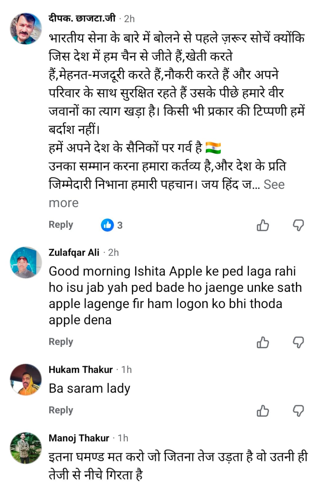 इशिता के इस बयान के बाद सोशल मीडिया में जमकर उनका विरोध हो रहा है। कुछ फौजी और आम लोग भी लाइव आकर इशिता की टिप्पणी का विरोध कर रहे हैं। सोशल मीडिया यूजर्स इशिता को माफी मांगने की चेतावनी दे रहे हैं।