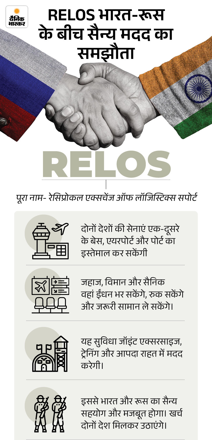 भारत और रूस के बीच रेसिप्रोकल एक्सचेंज ऑफ लॉजिस्टिक सपोर्ट (RELOS) रक्षा समझौता अब लागू हो गया है। इसके तहत दोनों देश एक-दूसरे की जमीन पर 3000 सैनिक तक तैनात कर सकेंगे। साथ ही 5 युद्धपोत और 10 सैन्य विमानों की तैनाती की भी अनुमति दी गई है।